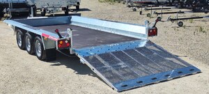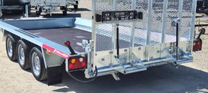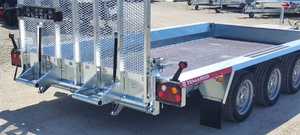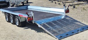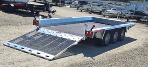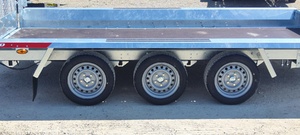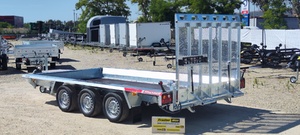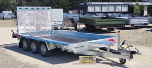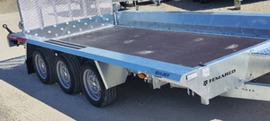 TrailerMax Utánfutócentrum M5 INÁRCS. Több mint 600 darab utánfutó-pótkocsi-trailer állandó készleten. Temared Builder 3 tengelyes gépszállító utánfutó. 400 x 183cm belső hasznos platóméret, 3500kg össztömeg, teli hátsó rámpa hátfal rugós rásegítéssel, rámpával egybeépített támasztó talpakkal. Tüzihorganyzott acél alváz és oldalfalak, rétegelt lemez fa padozat, lekötözéshez fülek az oldalak mentén. A nálunk vásárolt pótkocsikat igény esetén forgalomba helyezzük, ami lebonyolítható interneten keresztül otthonról is, elegendő csak az átvételkor eljönni telephelyünkre. A képek illusztrációs jelleggel készültek. A pontos felszereltségről és kiegészítőkről vásárlás előtt kérjük tájékozódjon elérhetőségeink egyikén, amennyiben az a leírásból nem derül ki egyértelműen.
